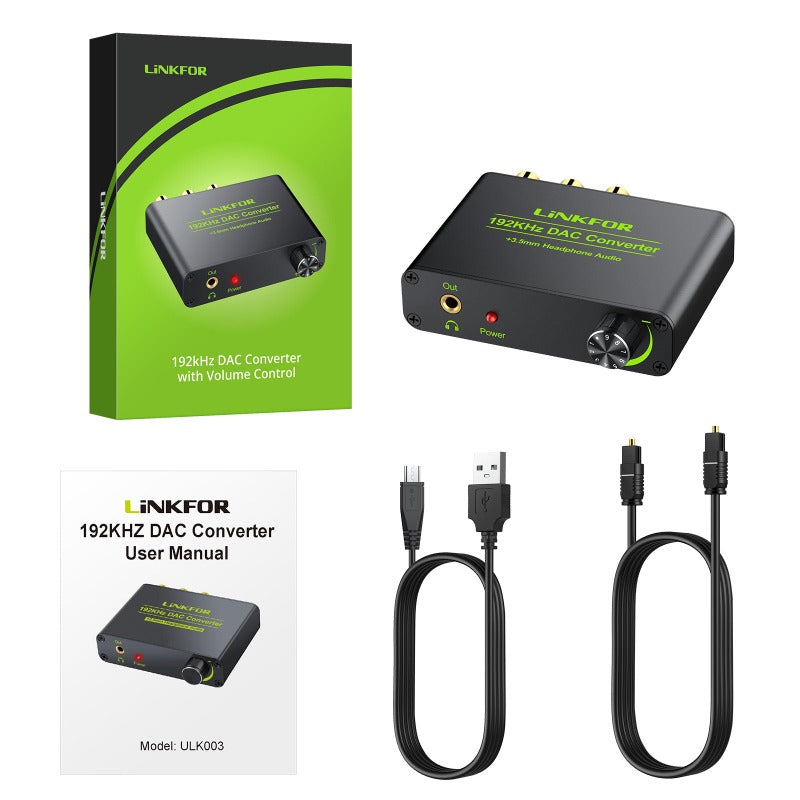 | LiNKFOR Bi-Directional Toslink to Coaxial Converter 192 kHz Metal 1X2 remove | LiNKFOR 192kHz DAC Converter with Volume Control remove | LiNKFOR 192kHz DAC Converter with Remote Control Support Volume Control Mute Power ON or OFF remove | LiNKFOR 192KHz DAC Digital to Analog Audio Converter with Bluetooth 5.0 remove | ||